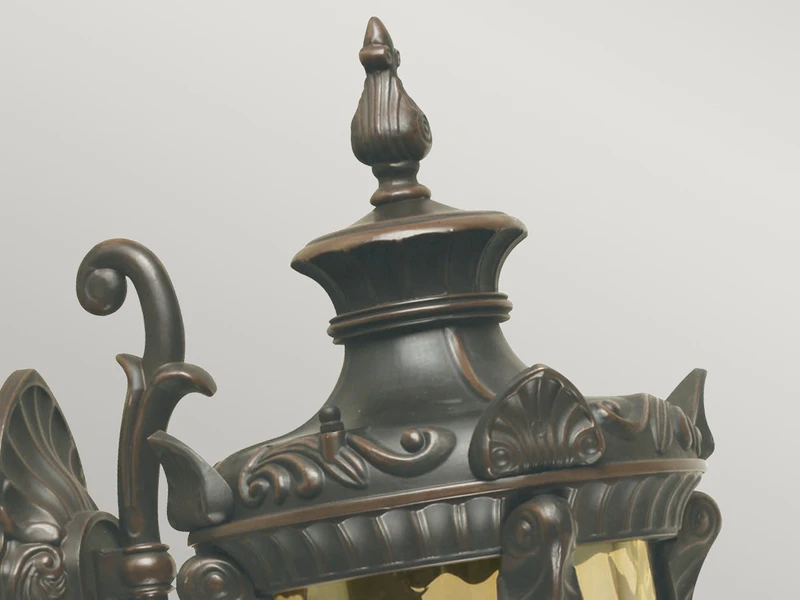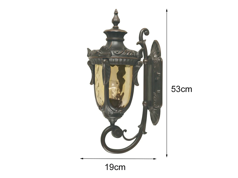 Im traditionell englischem Stil gehalten, erinnert diese Außenwandleuchte an Laternen aus vergangenen Zeiten um 1900. Der Lampenschirm besteht aus mundgeblasenem Amberglas. Die detailreichen Metallelemente in Bronze sind handbemalt und verleihen dieser Außenleuchte den typischen antiken Laternenlook.