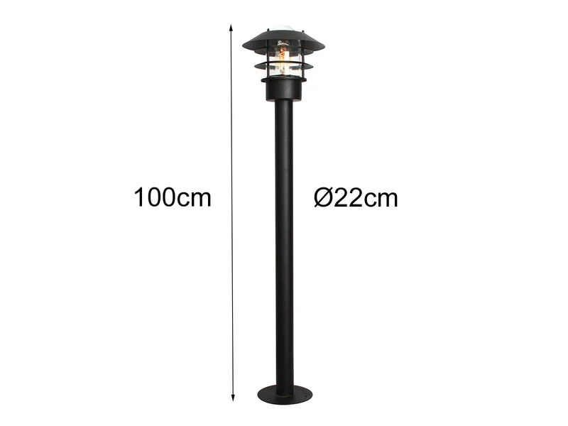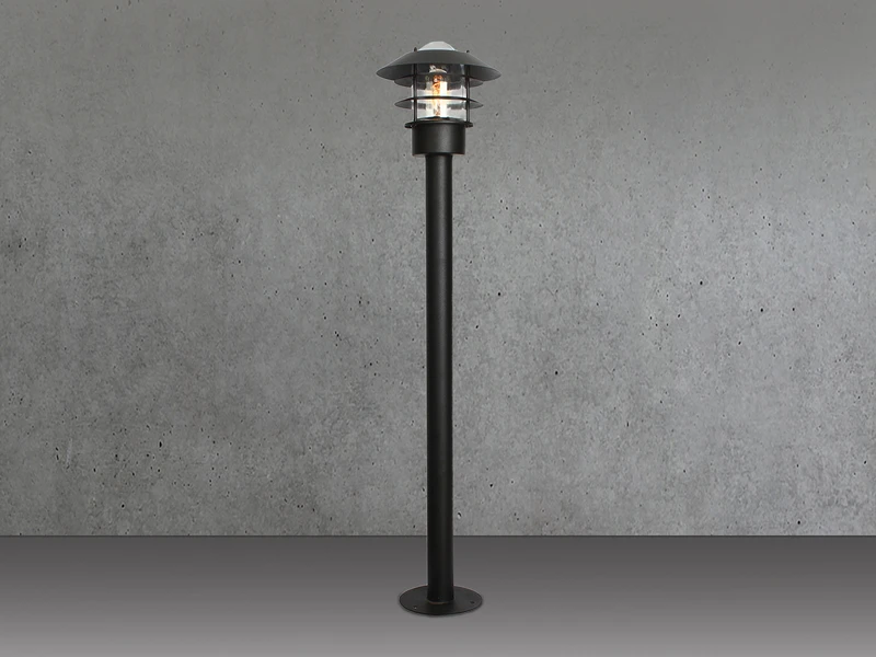 Gefertigt ist die stehende Außenlaterne aus Edelstahl 304 in Schwarz, welches zusätzlich pulverbeschichtet wurde, um der Leuchte zusätzliche Haltbarkeit zu verleihen. Somit ist sie robust genug um rauen Umgebungsbedingungen standzuhalten, und eignet sich daher hervorragend für den Einsatz in Küstengebieten. Der Lampenschirm besteht aus klarem Glas.
