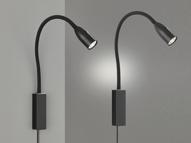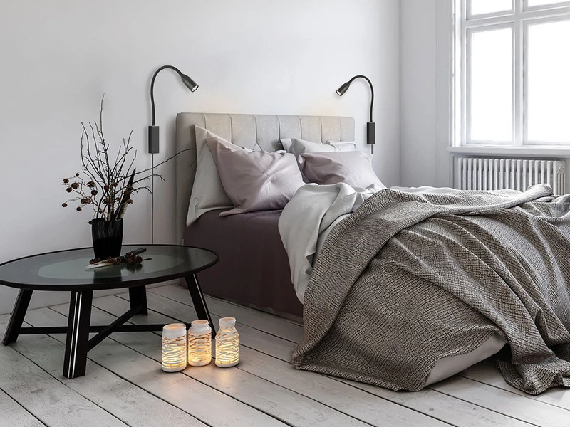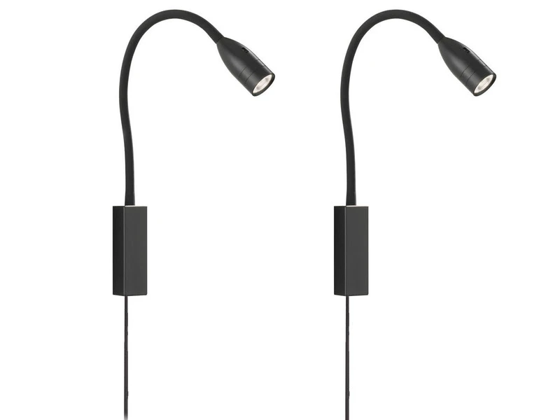 Der Korpus Leselampen besteht aus schwarzem Metall und ist flexibel biegsam. Dank der integrierten Montageplatte lassen sich die Leselampen im Handumdrehen direkt am Bett oder der Couch anschrauben. Wenn Sie sie klassisch als Wandlampen montieren möchten, nutzen Sie einfach die mitgelieferten Abdeckungen hierfür.