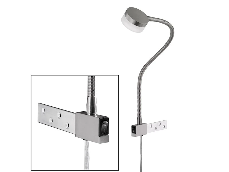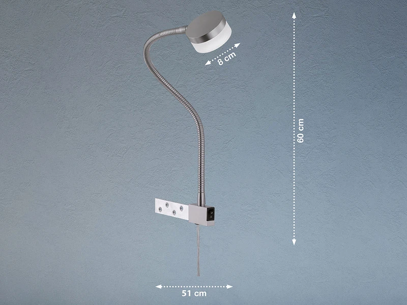 Jede Flexleuchte hat eine Ausladung von max. 51 cm und einen Durchmesser von 8 cm (Leuchtenkopf). Sie ist mit einem Schuko-Stecker ausgestattet, so dass sie über jede Steckdose angeschlossen werden kann. Mit dem in der Befestigung integrierten Ein-/Ausschalter können Sie die Möbelleuchte bequem bedienen. .