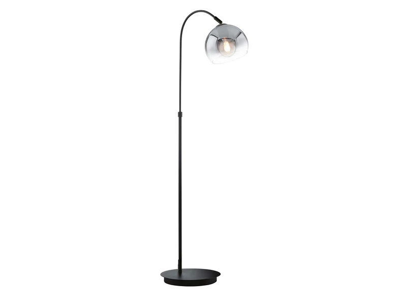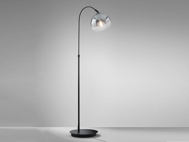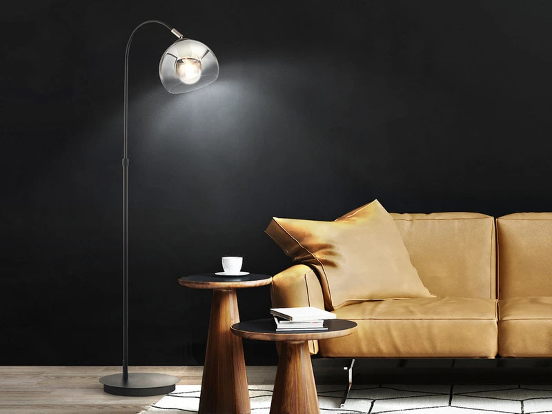 Der Leuchtenfuß und das Gestell der Stehlampe sind in sandschwarzem Metall gehalten und werden durch den schwenkbaren Lampenschirm aus Rauchglas harmonisch abgerundet.