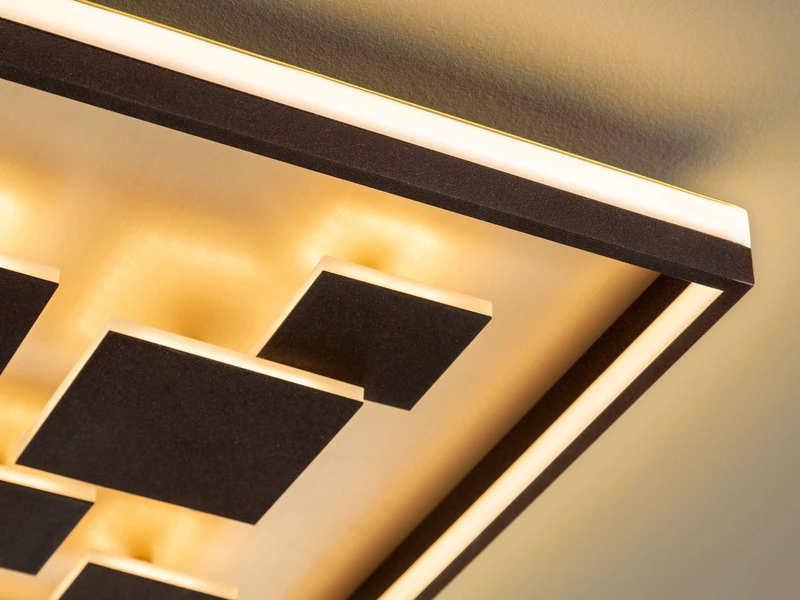 Ihre gesamte Schönheit zeigt die Deckenleuchte vor allem im eingeschalteten Zustand: Durch die aufgesetzten Quadrate, hinter denen sich die Lichtquellen „verstecken“, entsteht eine angenehme indirekte, aber dennoch helle Beleuchtung.