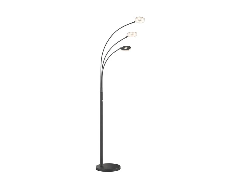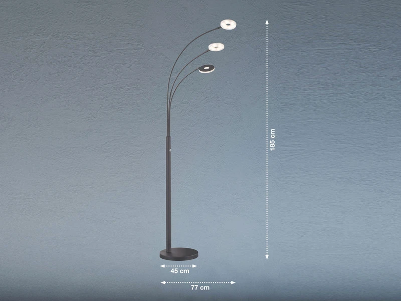 Über den Tasterschalter am Leuchtenkorpus lässt sich die Bogenlampe aus dem Hause Fischer & Honsel nicht nur an/ausschalten, sondern ist auch stufenlos dimmbar und lässt sich in 3 Stufen von Warmweiß bis Neutralweiß in der Lichtfarbe verändern.