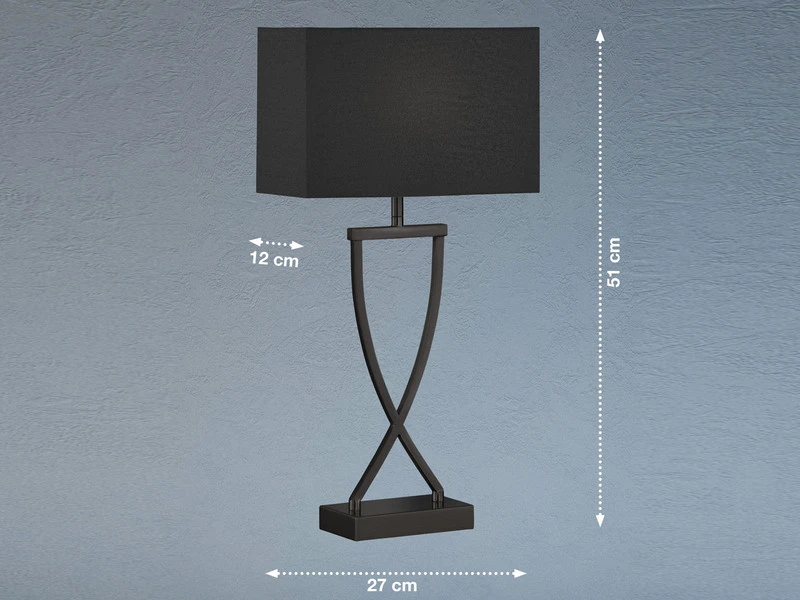 Das ansprechende Design der 51 cm großen Tischlampe erhält durch die elegante Form- und Farbgebung eine besondere Note. Der markant geschwungene Leuchtenfuß aus sandschwarzem Metall und der eckige, 27×12 cm große Lampenschirm aus schwarzem Stoff / innen Goldfarben verleihen der Tischleuchte ANNI ein besonders stilvolles Design.