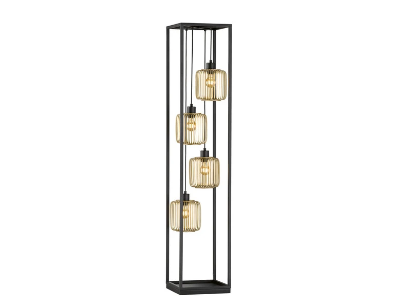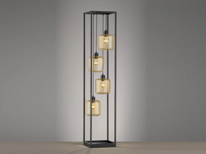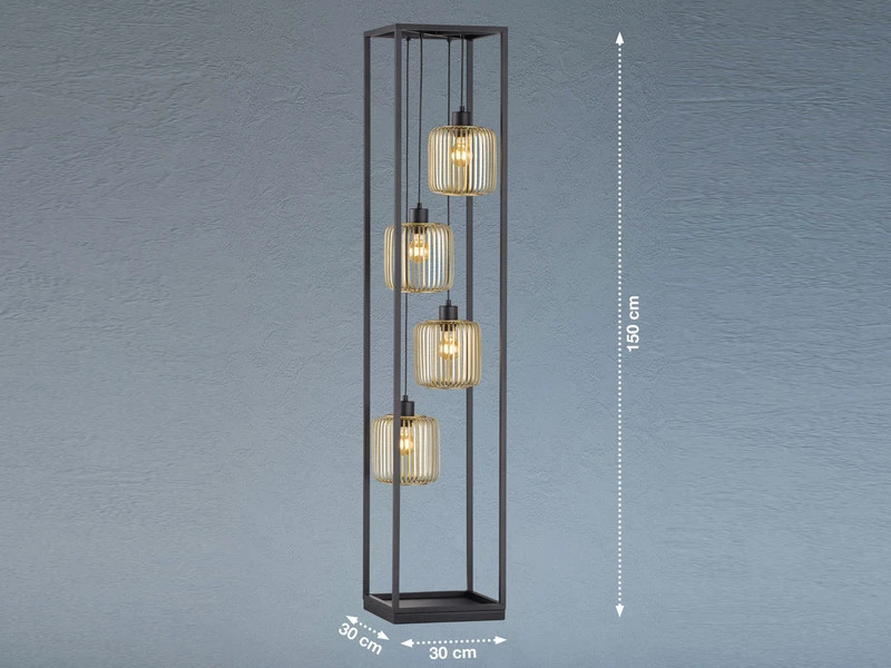 Der äußere Metallrahmen in mattem Schwarz hat eine Größe von 30×30 cm und ist 150 cm hoch. Die innenliegenden, goldfarbenen Lampenschirme in Lamellen Optik sind an unterschiedlich langen Aufhängungen angebracht. Sie sorgen für tolle Lichtspiele und runden den extravaganten Farb- und Formmix stilvoll ab.