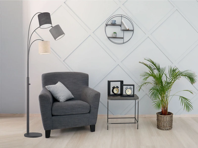 Kennzeichnend sind die drei zylinderförmigen Lampenschirme aus beige sandfarbenem, grauem und schwarzem Leinenstoff. Sie verleihen der Stehlampe ihren einzigartigen Charakter. Mit einem Durchmesser von jeweils 18 cm sorgen sie zudem für eine wohnliche Beleuchtung.