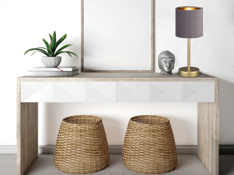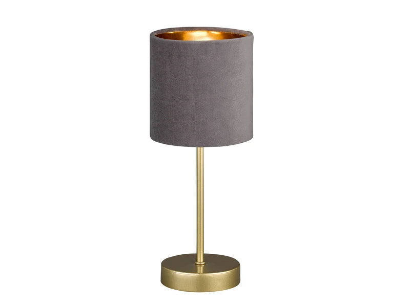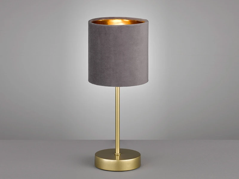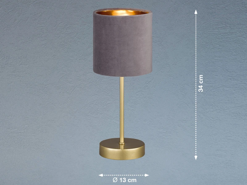 Die 34 cm hohe Tischlampe ist mit einem Schnurschalter ausgestattet, wodurch sie sich komfortabel bedienen lässt. Die Kombination aus feinem, goldfarbenem Metall und dem Stoffschirm in Grau, der von innen ebenfalls in goldfarben gehalten ist, sorgt für ein modernes Erscheinungsbild.