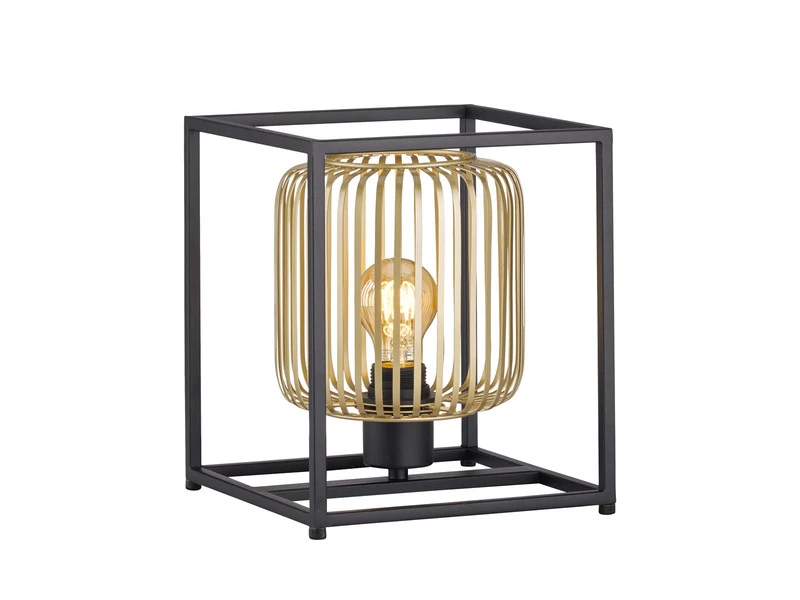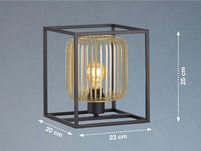 Der innenliegende, goldfarbene Lampenschirm in Lamellen Optik sorgt für tolle Lichtspiele im Raum, so dass eine warme, wohnliche Atmosphäre entsteht. Der äußere Metallrahmen in mattem Schwarz hat eine Größe von 23×23 cm und rundet den extravaganten Farb- und Formmix stilvoll ab.