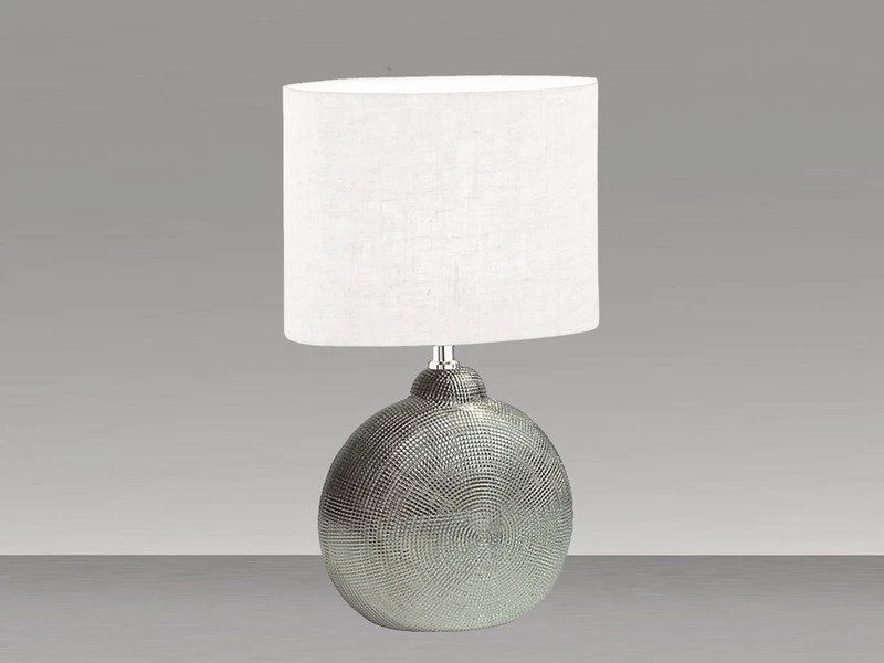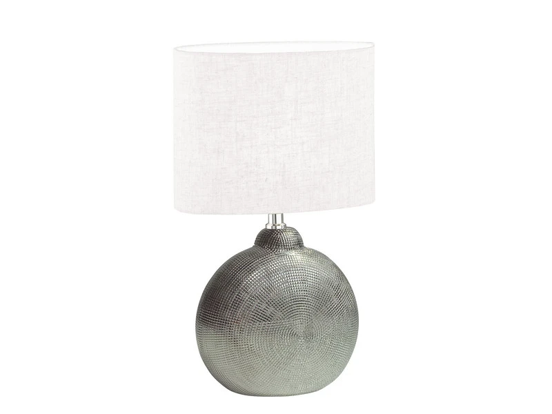 Der halbrunde Lampenfuß ist aus Keramik in Silberfarben Antik mit Struktur gefertigt. Der ovale, 23x13cm große Lampenschirm aus weißem Leinenstoff rundet das stilvolle Design der Tischleuchte harmonisch ab.