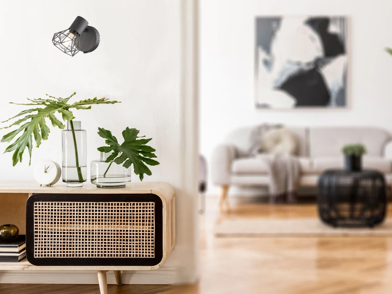 Das besondere Erscheinungsbild des 8cm breiten und 13,5cm hohen Wandstrahlers entsteht nicht zuletzt durch den „Käfig“ aus Metall, der den Blick freigibt auf das innenliegende Leuchtmittel. Besonders im eingeschalteten Zustand entfaltet der schwenkbare Strahler seine gesamte Schönheit, indem die Gitterform des Lampenschirms für interessante Lichtspiele sorgt.