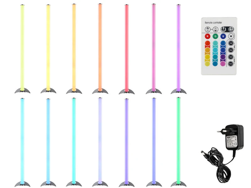 Die Stehlampen ROCKY haben eine Höhe von jeweils 121 cm. Der Röhrendurchmesser beträgt 5 cm. Jede Leuchte ist aus transparentem Kunststoff mit silberfarbenem Sockel und Abschlusskappe gefertigt. Die fest eingebauten RGB LED Leuchtmittel haben eine Leistung von jeweils 6 Watt. Die passenden Anschlusskabel mit Eurostecker sind ebenfalls mit im Lieferumfang enthalten.