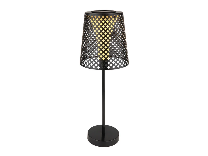 Mit ihrer Größe weiß diese Outdoor Tischleuchte schon im Hellen alle Blicke auf sich zu ziehen, doch im eingeschaltetem Zustand, entfaltet die Leuchte ihre schönste Seite. Der Metallschirm mit ausgeschnittenem Rautenmuster sorgt im Dunkeln für faszinierende Lichtspiele und eine echte Wohlfühlatmosphäre.