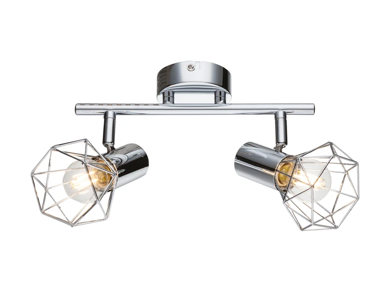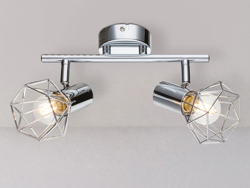 Das besondere Erscheinungsbild des Deckenstrahlers entsteht durch den beiden verchromten Gitterlampenschirmen die den Blick auf die Leuchtmittel freigeben.