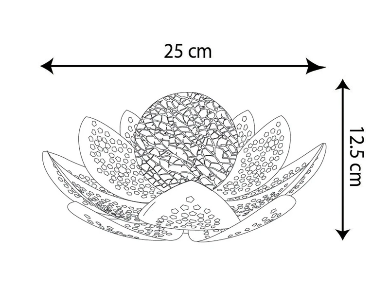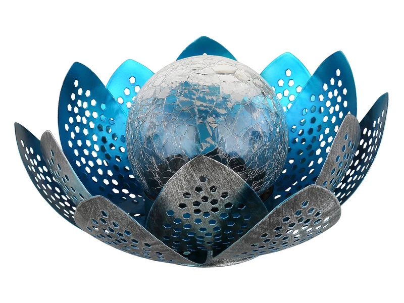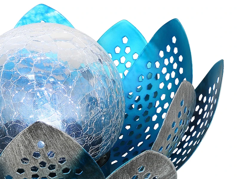 Diese Solarleuchte in Form einer Seerose ist mit einer blauen Glaskugel in Bruchoptik versehen, welche in 6.500 Kelvin tageslichtweiß leuchtet. Sie hat einen Durchmesser von 25cm, besteht aus Metall mit einer Dekorstanzung in Silber-Blau und ist ein schönes Dekorationselement für Ihren Outdoor Bereich. An der Unterseite der Leuchte befindet sich ein Schiebeschalter zum Ein- und Ausschalten.