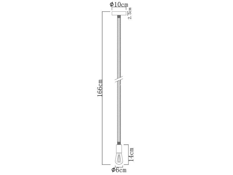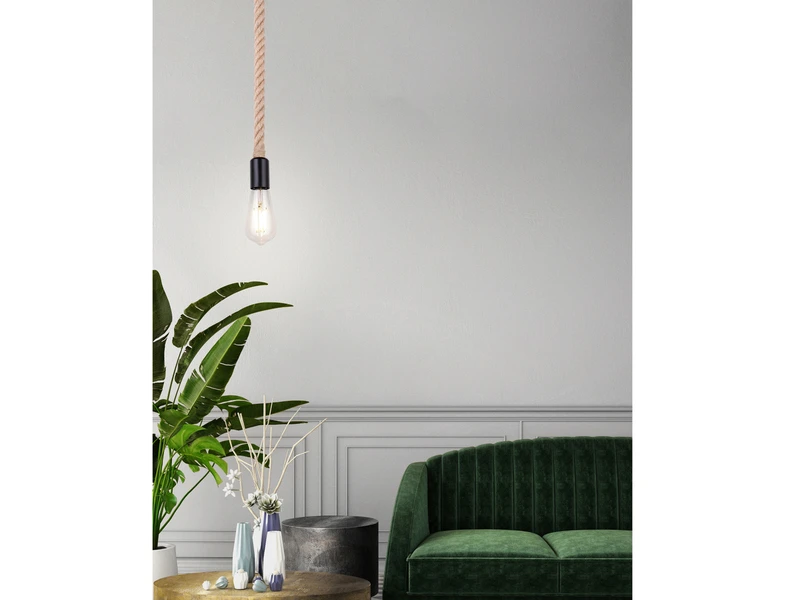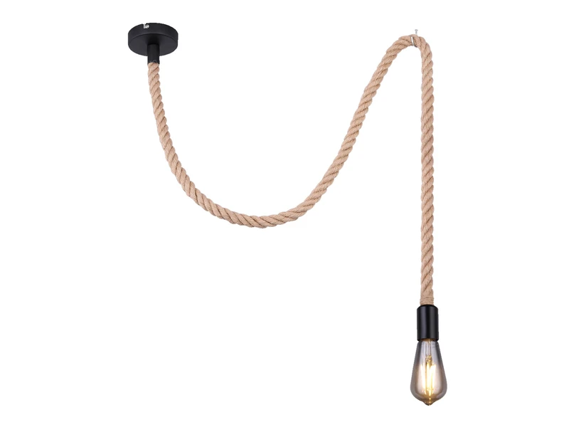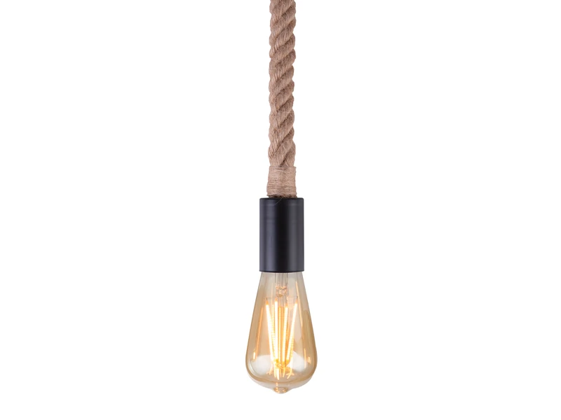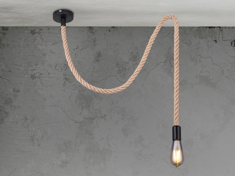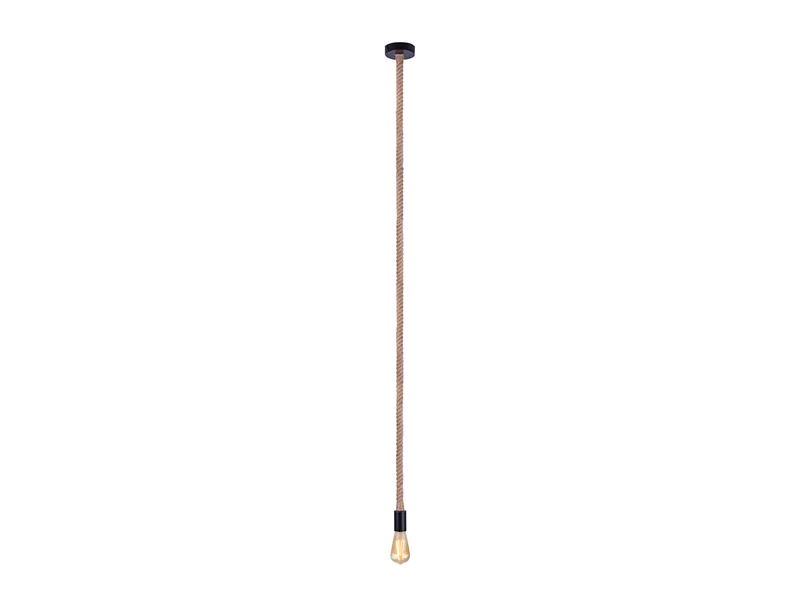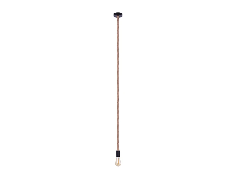 Die Pendelleuchte besteht aus einem 160cm langen Hanfseil und am Ende befindet sich eine E27-Fassung aus schwarzem Metall. Die Montageplatte beträgt einen Durchmesser von 10cm. Hiermit handelt es sich um eine lange und schmale Hängeleuchte, die durch ihr schlichtes Design in verschiedenen Einrichtungsstilen passt.