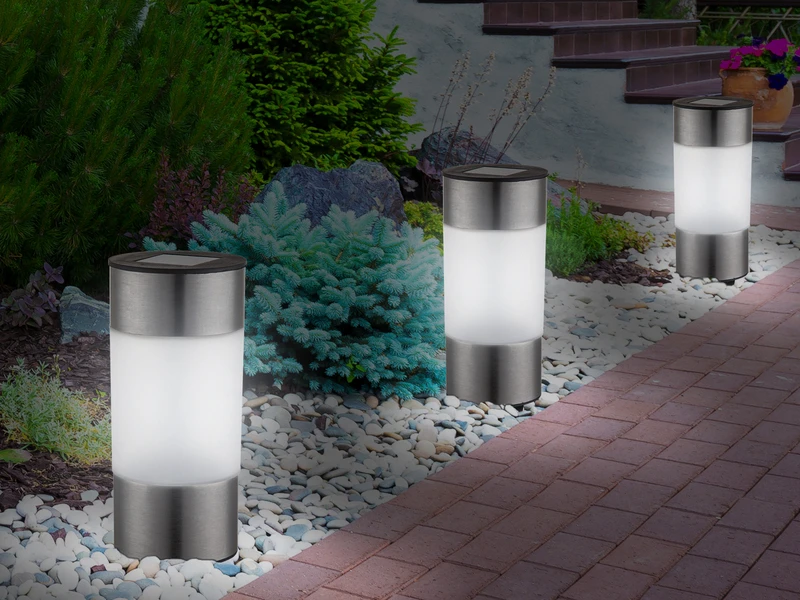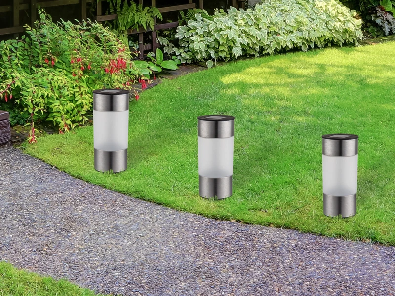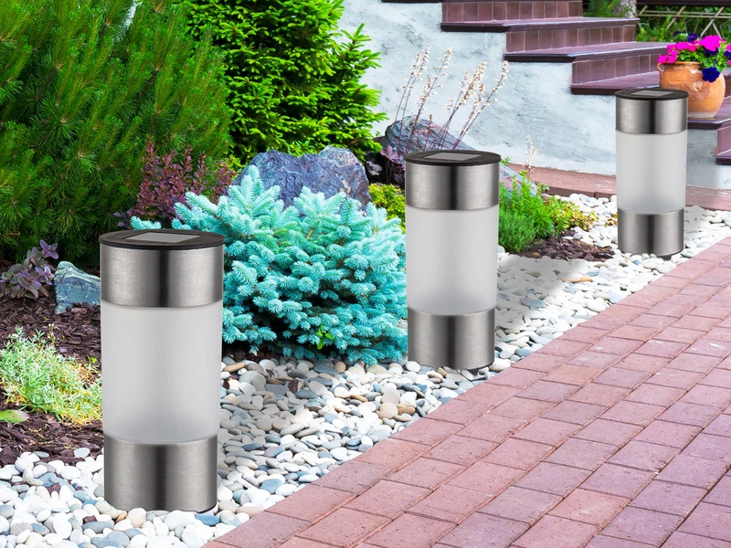 Die Gartenleuchten sind aus satiniertem Edelstahl gefertigt und bieten die Schutzart IP44 an. Somit sind die Solarlampen spritzwassergeschützt und für den Garten und Außenbereich ideal geeignet.