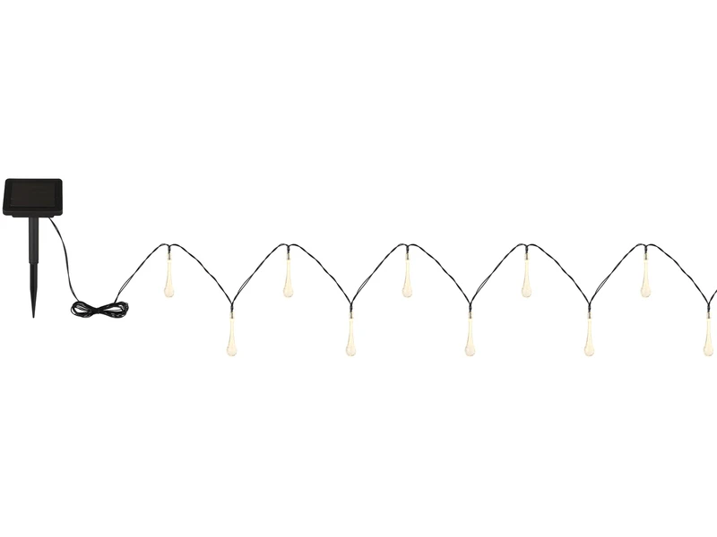 Diese dekorative Solarlichterkette aus Kunststoff hat eine Gesamtlänge von 4,8 Metern und ist mit 20 tropfenförmigen Lichtquellen ausgestattet, die eingeschaltet einen schönen Lichteffekt auf der Terrasse oder dem Balkon zaubern.