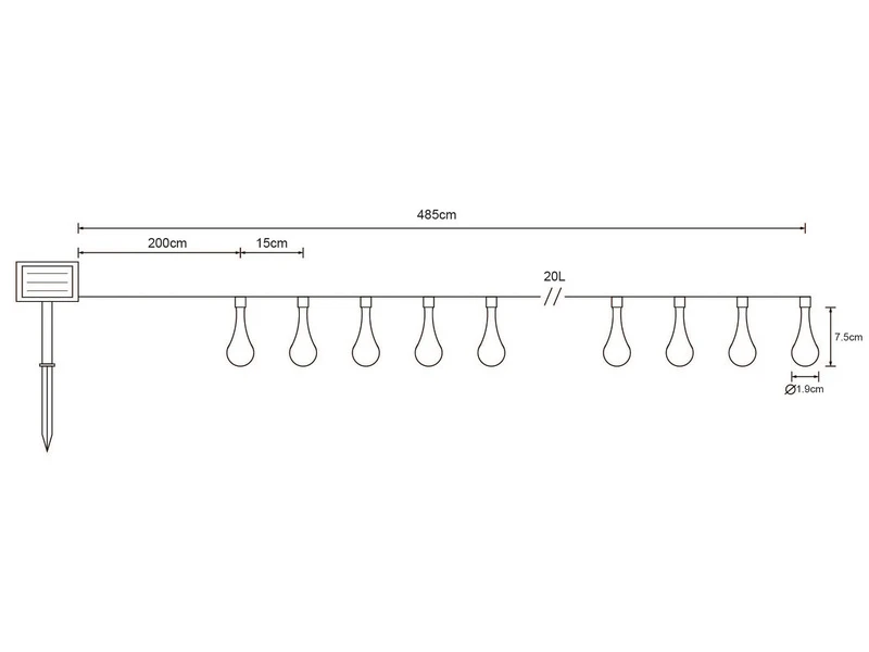 Die Lichterkette wird über ein separates angebrachtes Solarpanel tagsüber aufgeladen. Bei anbrechender Dunkelheit gibt sie ihr gespeichertes Licht wieder ab. Die 20 Lichtquellen haben eine Leistung von jeweils 0,06 Watt und 2.700 Kelvin warmweiß. Der inkludierte AA NiMh Akku ist austauschbar.