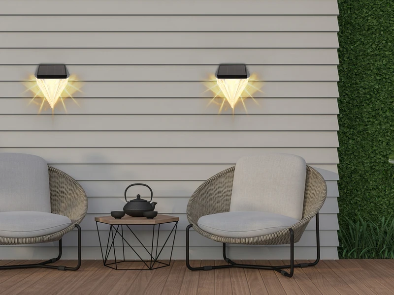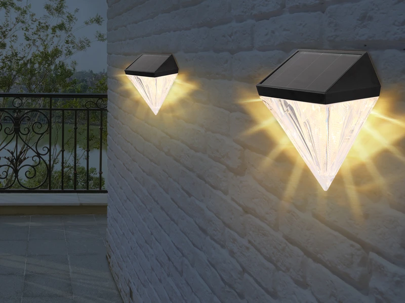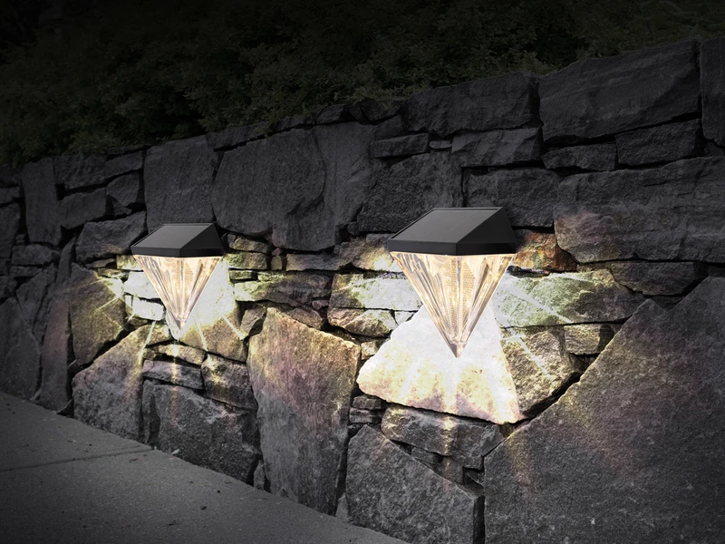Tagsüber wird das fest verbaute LED Modul der jeweiligen Solarlampen über das Solarpanel aufgeladen und sorgt dafür, dass die Außenwandlampen bei vollständiger Aufladung bis zu 8 Stunden leuchten. Die LEDs haben eine jeweilige Leistung von 0.5 Watt und strahlen mit 10 Lumen bei einer warmweißen Farbtemperatur von 3000 Kelvin. Die Lichtausbeute beträgt 7 Lumen.