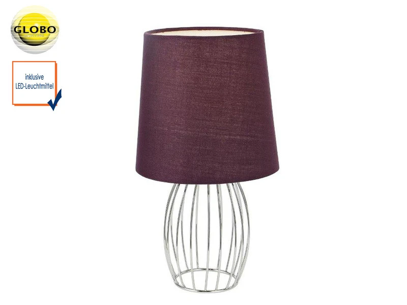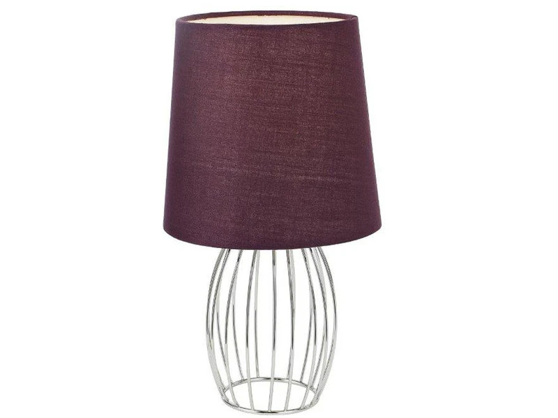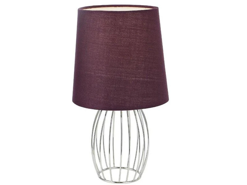 Das moderne Design der 29 cm hohen Tischlampe erhält durch das Metallgitter in glänzendem Chrom eine besondere Note. Der Schirm ist aus lila farbenem Stoff gefertigt. Er hat einen Durchmesser von 16 cm. Über einen Schnurschalter für Ein/Aus lässt sich die Tischleuchte komfortabel bedienen.