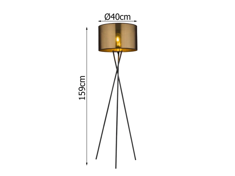 Diese edle Stehlampe besteht aus einem Kunststoffschirm in glänzendem Gold überzogen mit einem Stoffnetz in Schwarz, welcher auf drei überkreuzte, schwarz-matte Metallstäbe gesetzt ist. Das stilechte Design verleiht der Stehlampe ihren unverwechselbaren Charakter und sorgt gleichzeitig für ein harmonisches Licht Ambiente.
