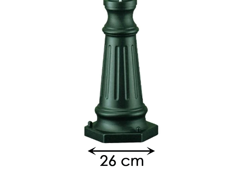 Die Gartenlaterne bestehen aus grün lackiertem Aluminium und klarem Glas. Sie werden inkl. Pfahl und Befestigungsstange für Fundament geliefert. Der Standfuß hat einen Durchmesser von ca. 26 cm.