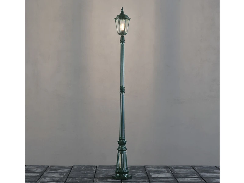 Die Gartenlaterne sind aus grün lackiertem Aluminium und klarem Glas gefertigt. Sie werden inkl. Pfahl und Befestigungsstange für Fundament geliefert. Der Standfuß hat einen Durchmesser von ca. 26 cm.