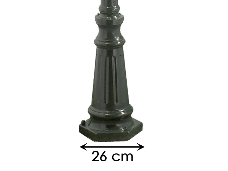 Die Mastleuchten bestehen aus grün lackiertem Aluminium und klarem Glas. Sie werden inkl. Pfahl und Befestigungsstange für Fundament geliefert. Der Standfuß hat einen Durchmesser von ca. 26 cm.
