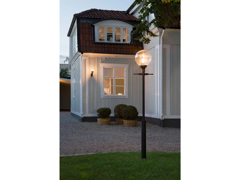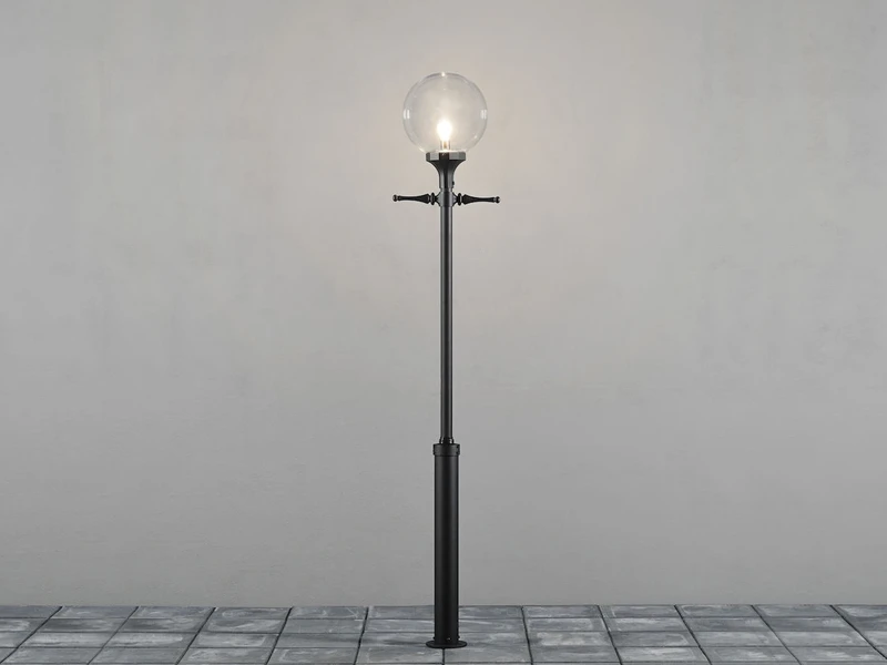 Gefertigt ist diese Mastleuchte, die von der Form her an eine nostalgische Straßenlaterne erinnert, aus klarem Acrylglas und schwarzem Aluminium. Je nach Leuchtmittel erhalten Sie hier eine sehr schöne Gartenbeleuchtung oder Straßenbeleuchtung.