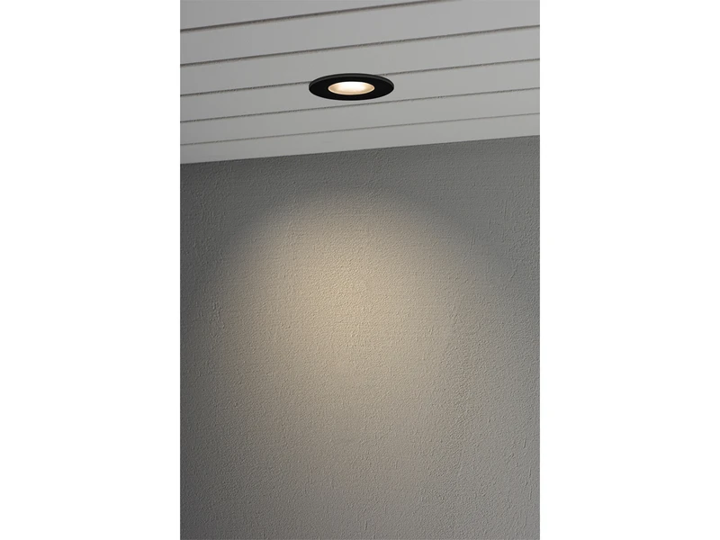 Gefertigt ist die Deckenlampe aus Schwarz mattem Metall mit klarem Glas. Der Spot hat einen Durchmesser von 11cm sowie eine Einbautiefe von 8cm. Als Einbaumaß benötigen Sie einen Deckenausschnitt von 9,6cm und eine Einbautiefe von 10cm für den flachen Strahler.