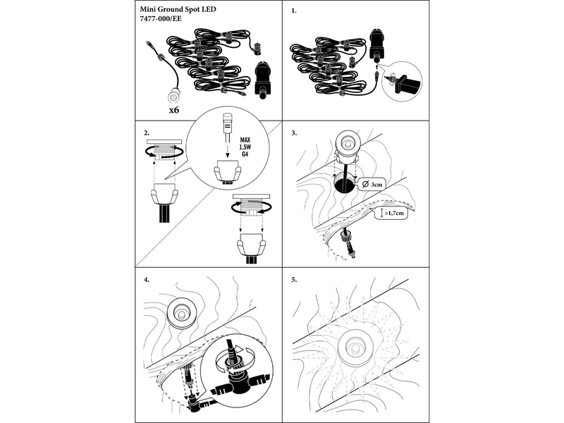 - Das Basis Set ist geeignet für 6 x G4 Leuchtmittel bis max. 1,5 Watt (nicht enthalten)