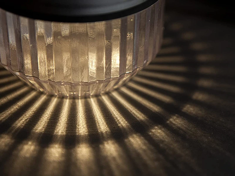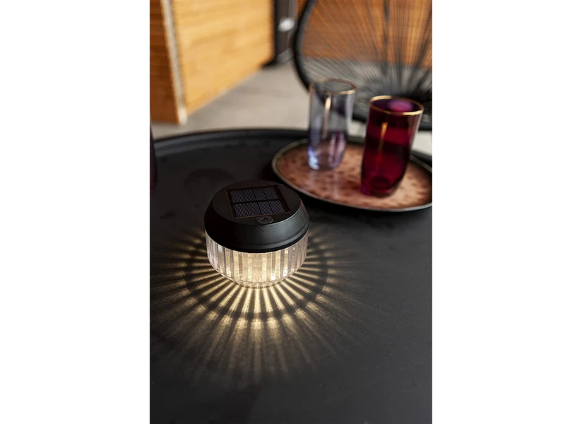 Ob auf der Terrasse, dem Balkon oder der Sitzecke im Garten, die kleine Tischleuchte sorgt mit ihrem geriffelten Glas für stimmungsvolle Lichtakzente und eine angenehme Atmosphäre.