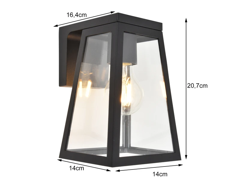 Die rustikale Wandlaterne ist aus Aluminiumguss gefertigt und setzt mit der Farbgebung in Schwarz matt, in Kombination mit dem transparenten Glas, gekonnte Akzente an der Hauswand, die Schutzart IP44 unterstreicht die Witterungsbeständigkeit der eckigen Leuchte. Die Wandleuchte hat eine Höhe von 20,7cm, eine Breite von 14×14 cm und Tiefe 16,4cm ab Wand.