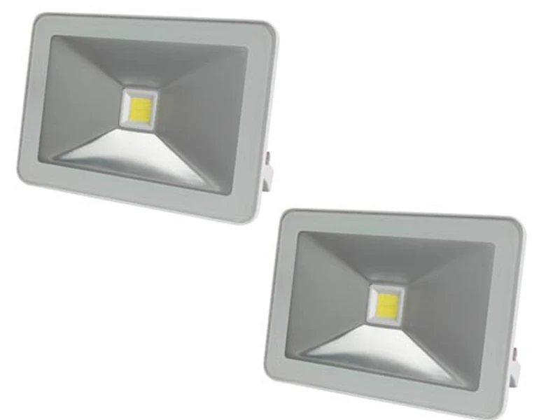 Gefertigt sind die Strahler aus robustem, weißem Aluminium. Mit ihrem schlanken Design nehmen sie auch auf einer beengten Baustelle nur wenig Platz ein. Die LED Scheinwerfer sind gerade einmal 3,5 cm dick und haben ein Außenmaß von 13 x 9 cm. Dennoch überzeugen sie mit einer starken Leistung von jeweils 10 Watt und 750 Lumen in Warmweiß.
