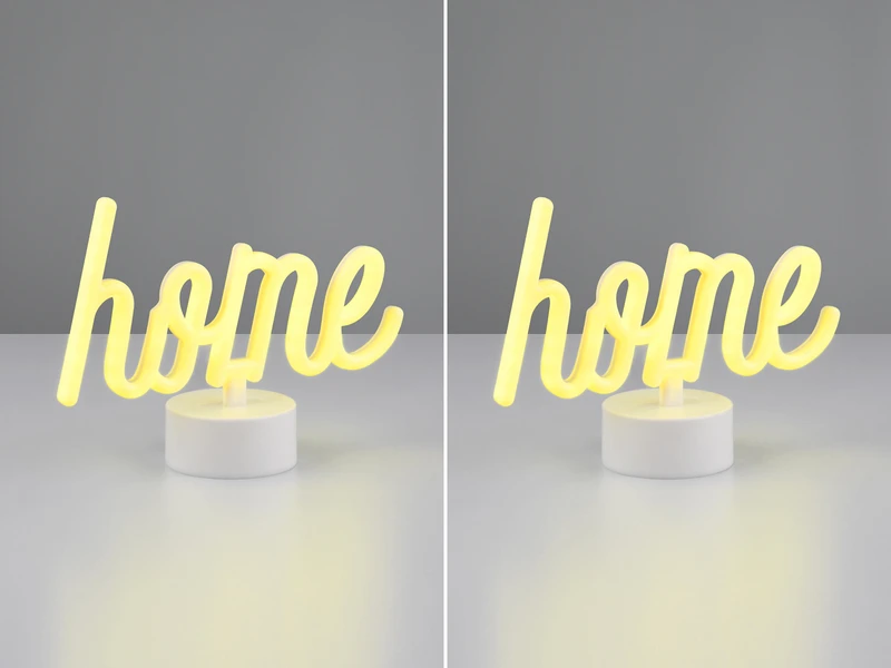 Die 16cm hohe Dekolampen mit dem Leuchtschriftzug „home“ können wahlweise mit dem mitgelieferten USB Kabel (inkl. Netzadapter) oder ganz unabhängig vom Stromanschluss mit 3x AA 1,5 Volt Batterien (nicht im Lieferumfang enthalten) betrieben werden.