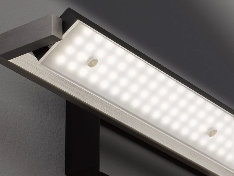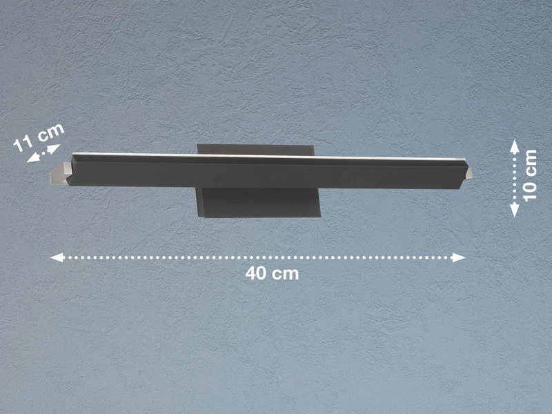 Der schmale, klar definierte Leuchtenkorpus aus Metall hat eine Länge von 40cm. Insgesamt hat jede der beiden Wandleuchte eine Höhe von 10cm und eine Wandausladung von 11cm. Der Leuchtenkopf ist mit einer Weiß matten Acrylglasabdeckung versehen und schwenkbar, so dass Sie die Wandlichter sowohl als Uplight, Downlight oder für eine indirekte Wandbeleuchtung nutzen können.