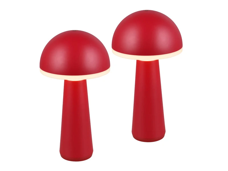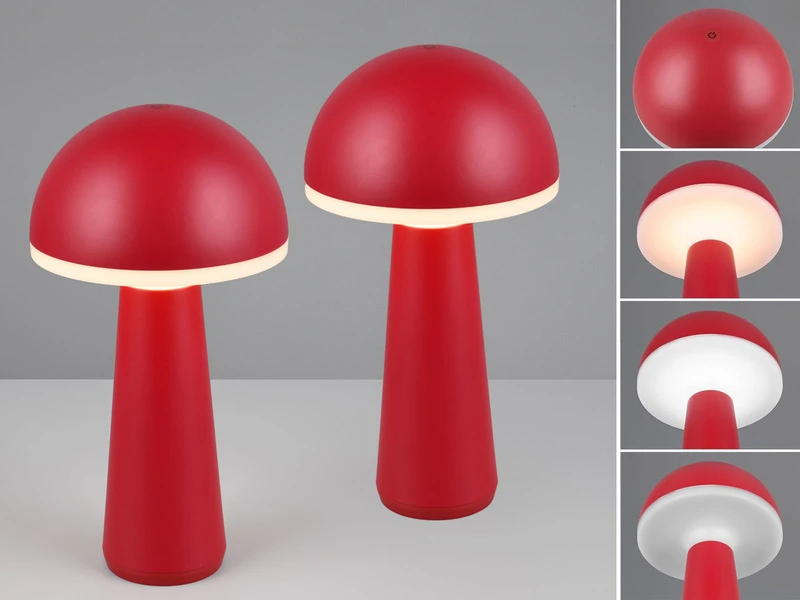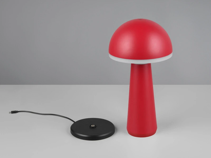 Die 30cm hohe Leuchte aus Druckguss Aluminium ist über die mitgelieferte Ladestation (Station mit USB Kabel) ganz einfach aufladbar und kommt überall dort zum Einsatz, wo ein Stromanschluss fehlt. Ihr charakterstarkes Pilzdesign und die zeitgemäße Farbe in Rot machen die Tischleuchte zu einem auffälligen Dekorationselement.