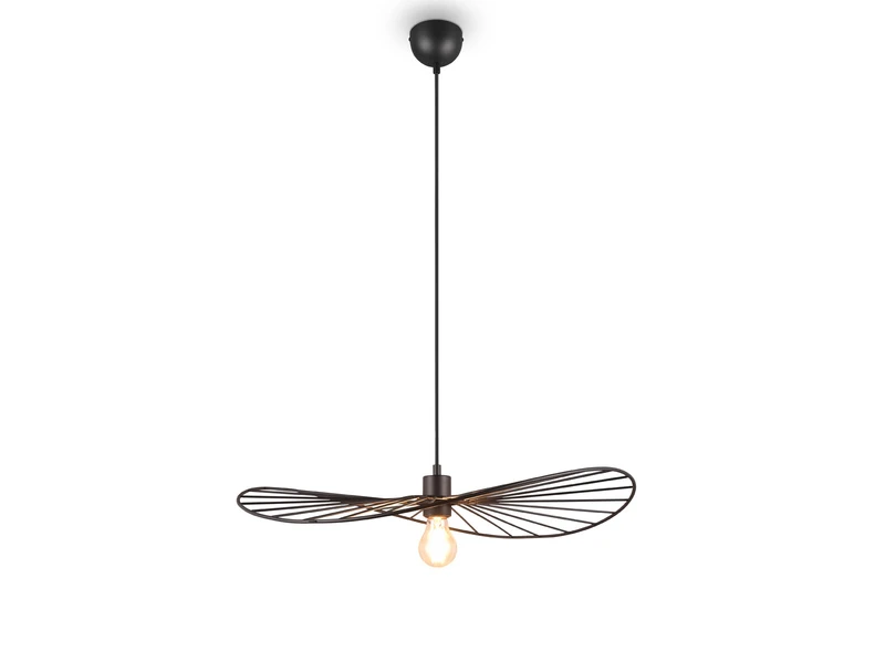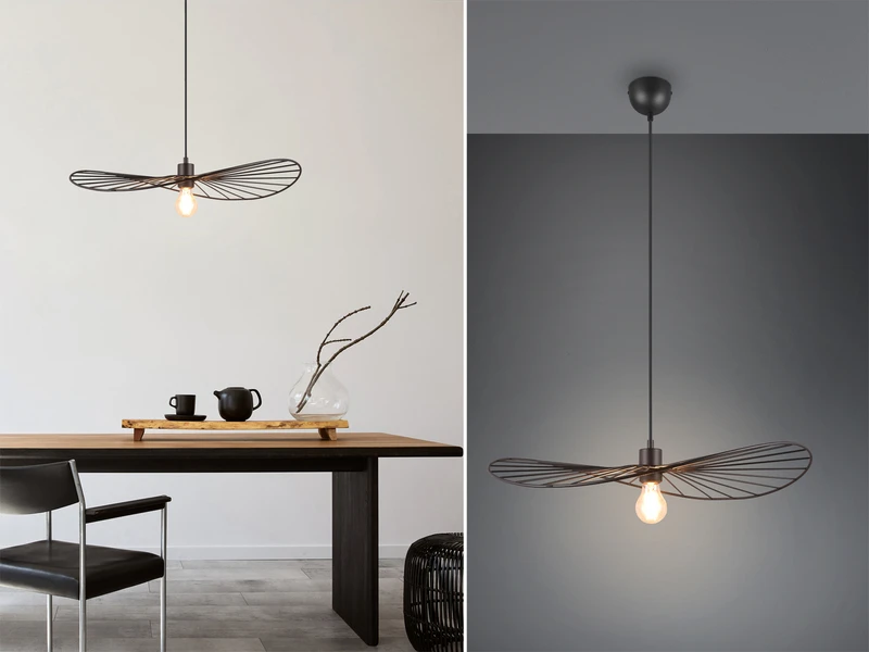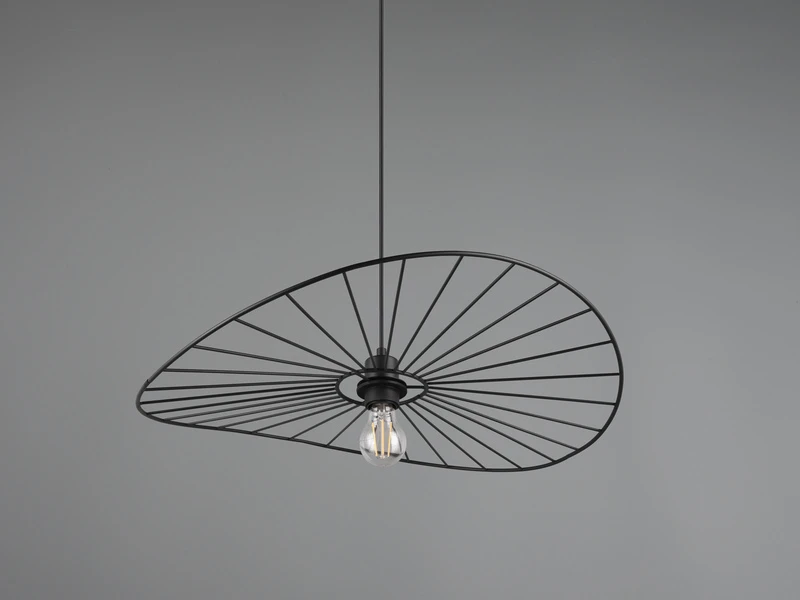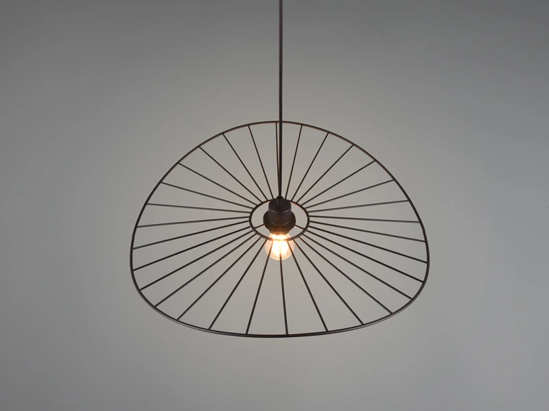 Das besondere Design der Hängeleuchte ist geprägt durch den filigranen Retro Leuchtenschirm mit einem Durchmesser von 60cm aus Metall in Schwarz matt.