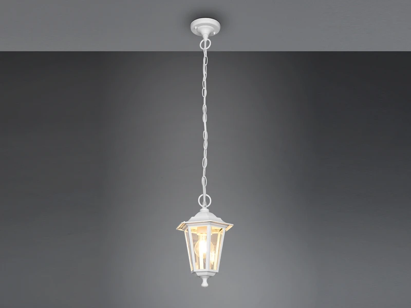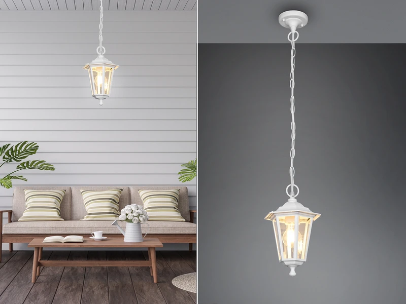 Die Pendelleuchte PIENZA passt sich durch ihr Design im klassischen Landhausstil fast jedem Bereich an und ist eine ideale Außenbeleuchtung für die Terrasse, den Balkon oder den Hauseingang. Gefertigt ist die Außenleuchte aus wetterfestem Aluminium. Durch die Oberfläche in Weiß matt wirkt sie dabei besonders zeitlos. Ergänzt wird die Leuchte durch den Lampenschirm aus klarem Glas, der für die typische Laternenoptik sorgt.