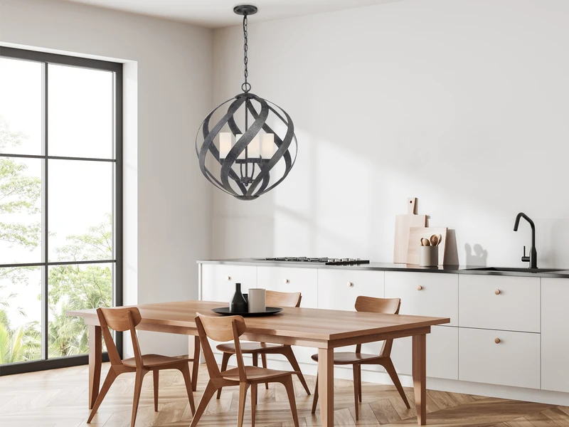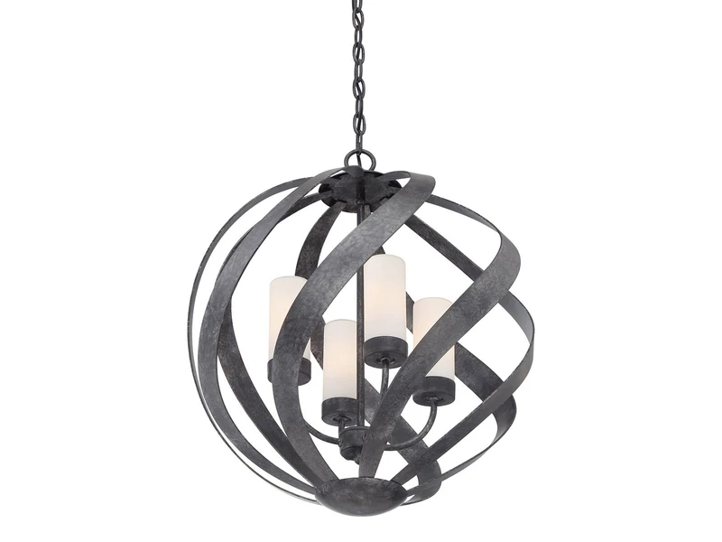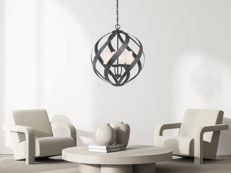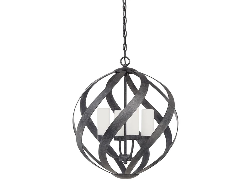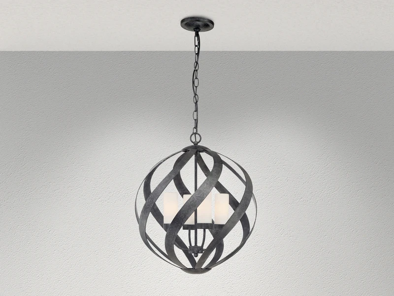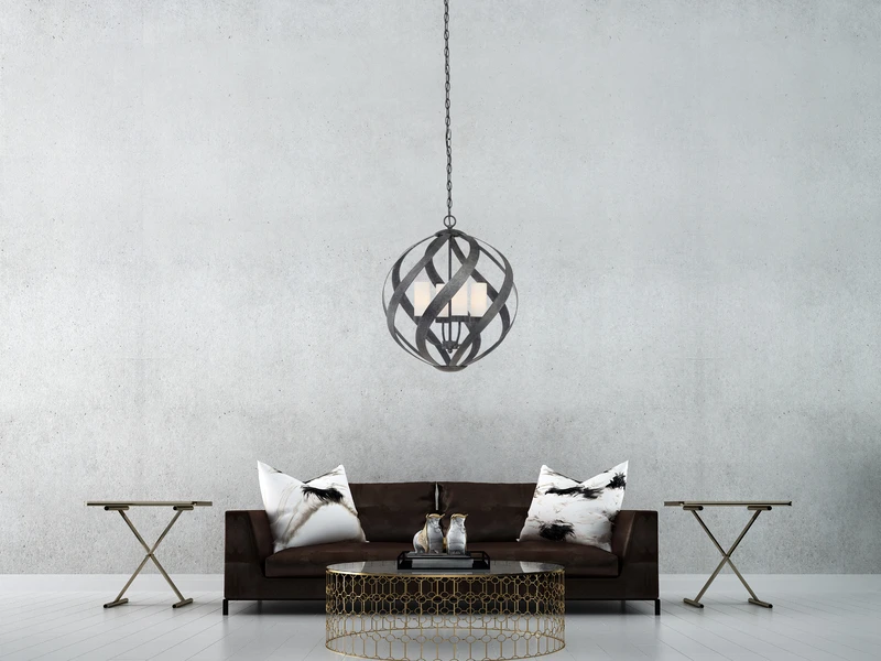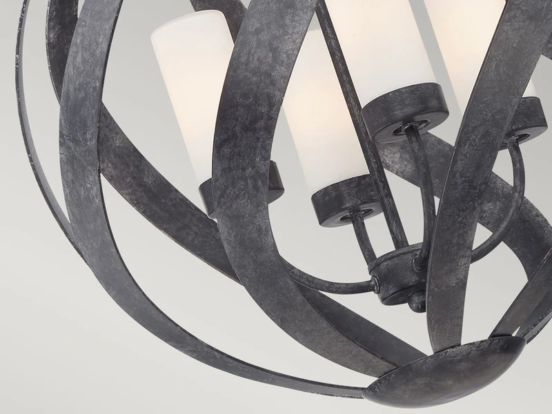 Der robuste Lampenschirm aus Stahl bewegt sich in weichen Kurven entlang einer kugelförmigen Silhouette. Die altschwarze Oberfläche enthält Akzente aus Holzkohle und dunklem Silber für einen schwülen, rauchähnlichen Effekt. Die Kerzen sind mit zylindrischen Schirmen aus mattiertem Glas ausgestattet, die das Licht dieser atemberaubenden Kollektion weicher machen.