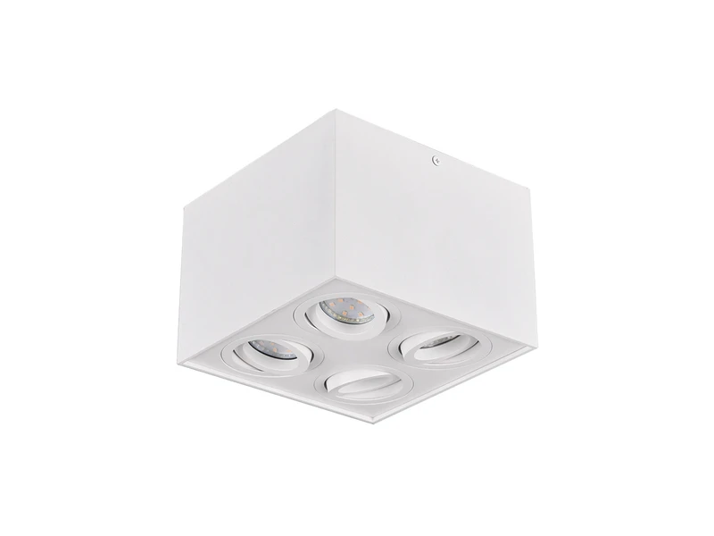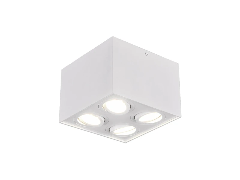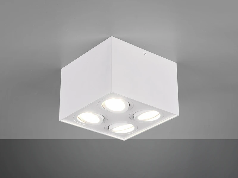 Dank des eckigen Designs aus weiß mattem Metall ist diese schwenkbare Spotlampe schon im Hellen ein wahrer Hingucker.