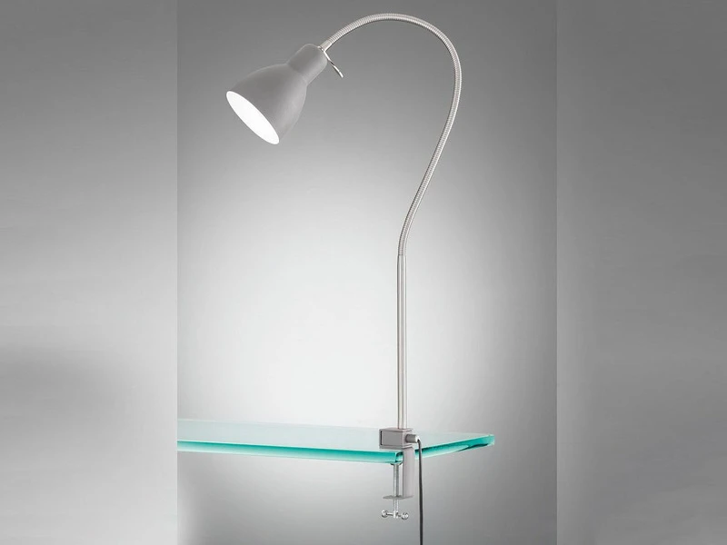 Die Oberfläche der Klemmlampe besteht aus Metall in Sandgrau, der Flexschlauch ist in Nickel matt gehalten. Die Leuchte hat eine Ausladung von 65 cm, ist – je nach Einstellung des Flexschlauchs – zwischen 50 cm bis 100 cm hoch und lässt sich an allen Möbelstücken oder Regalbrettern mit einer Klemmbreite von 1 cm bis max. 6,5 cm befestigen.