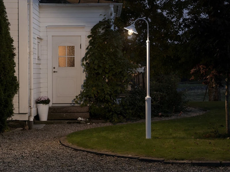 Gefertigt ist Mastleuchte im Design einer klassischen Straßenlaterne aus weiß lackiertem Aluminium. Das klare Glas sorgt für eine schöne Gartenbeleuchtung bzw. Straßenbeleuchtung.