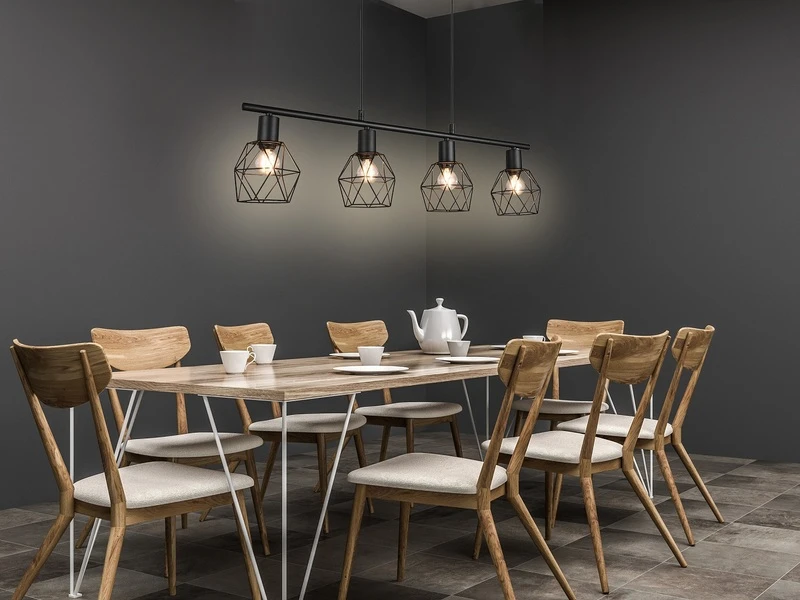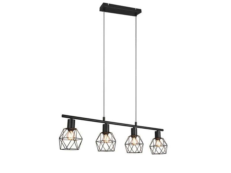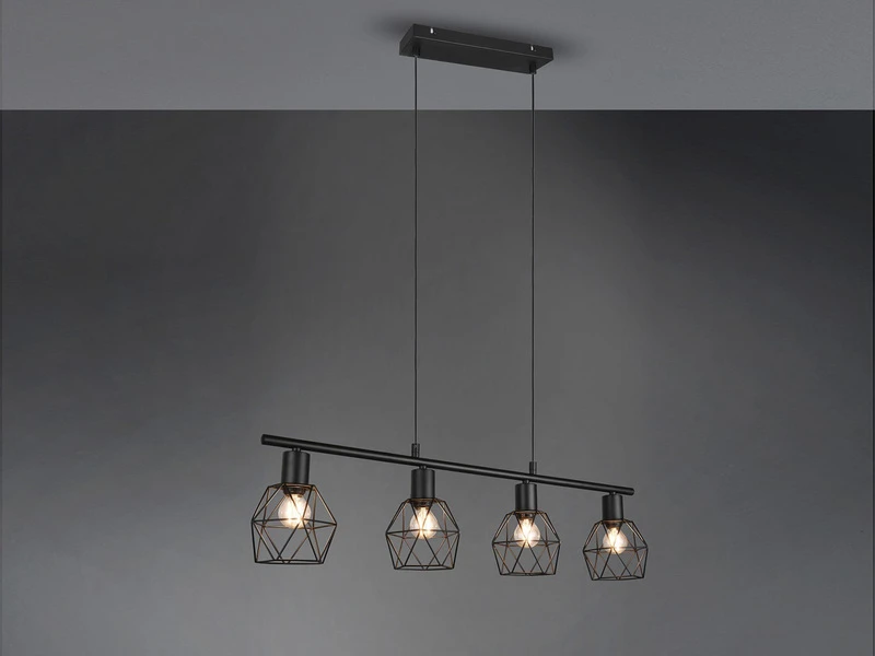 Das besondere Erscheinungsbild der Deckenhängelampe entsteht durch die schwarzen Gitterlampenschirme die den Blick auf die Leuchtmittel freigeben.