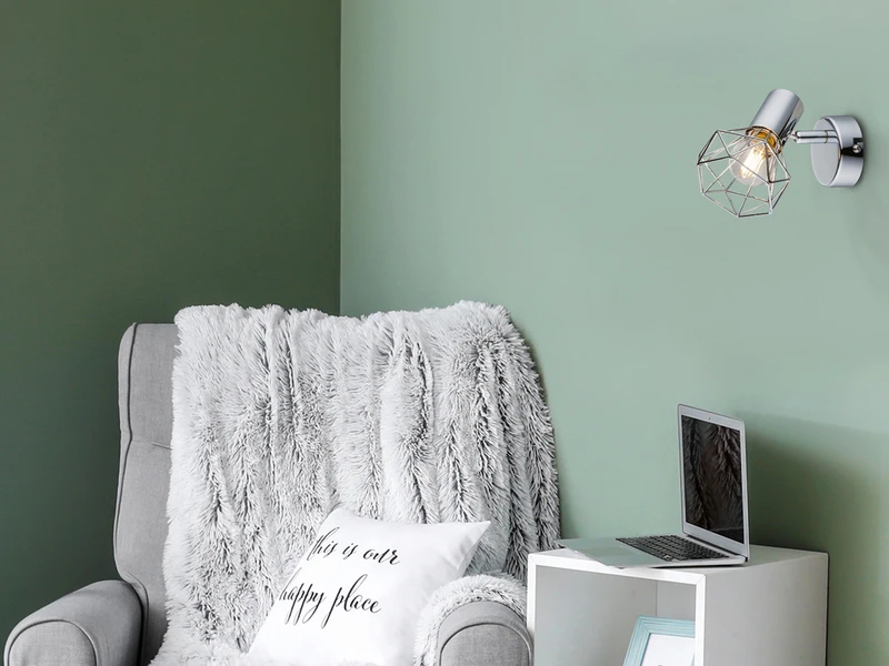 Das besondere Erscheinungsbild des Wandstrahlers entsteht durch den verchromten Gitterlampenschirm der den Blick auf das Filament LED Leuchtmittel freigibt.