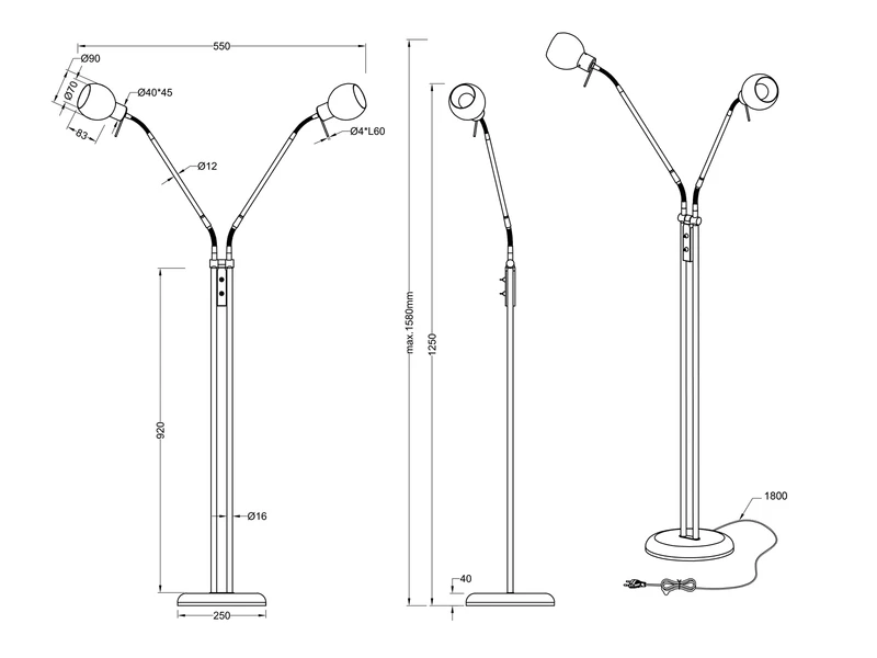 Besonders praktisch ist der Flexarm der Stehlampe, mit der Sie Ihren persönlichen Lichtwinkel komfortabel einstellen können. Durch dieses „Feature“ eignet sich die Leuchte nicht nur als klassische Wohnraumleuchte, sondern kann auch prima als dekorative Leselampe genutzt werden. Die Gesamthöhe beträgt dabei je nach Einstellung 125cm. Mit den beiden Ein-/Ausschaltern können Sie die Stehleuchte jederzeit bequem getrennt bedienen.