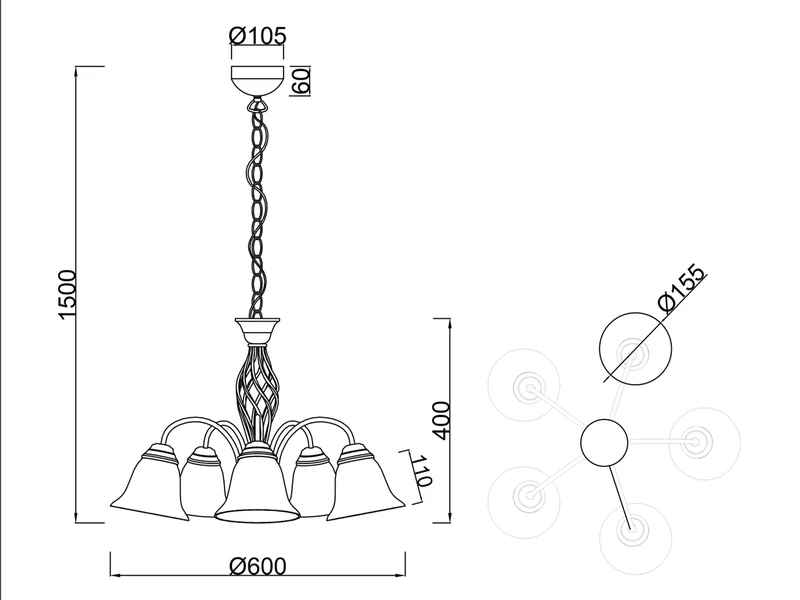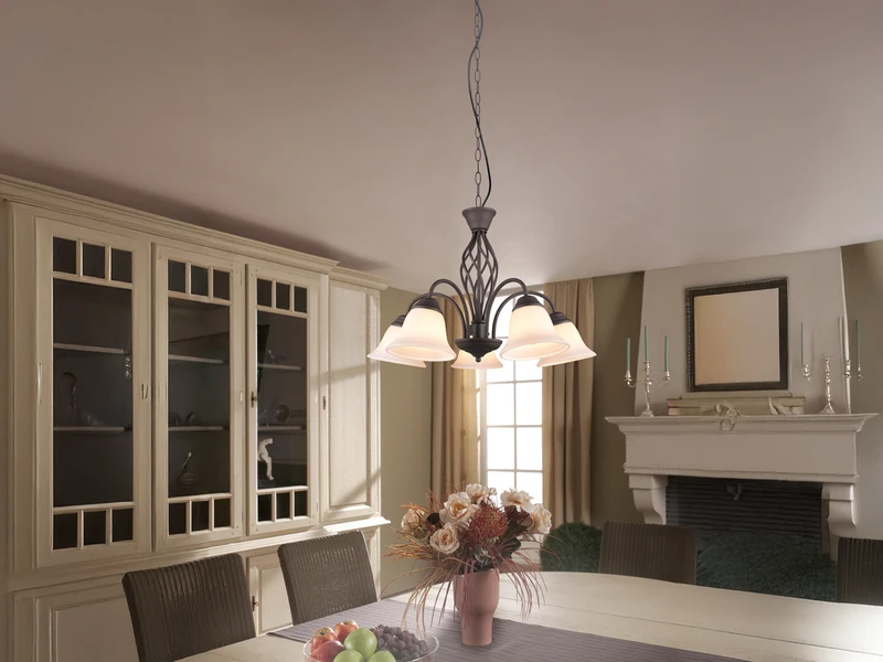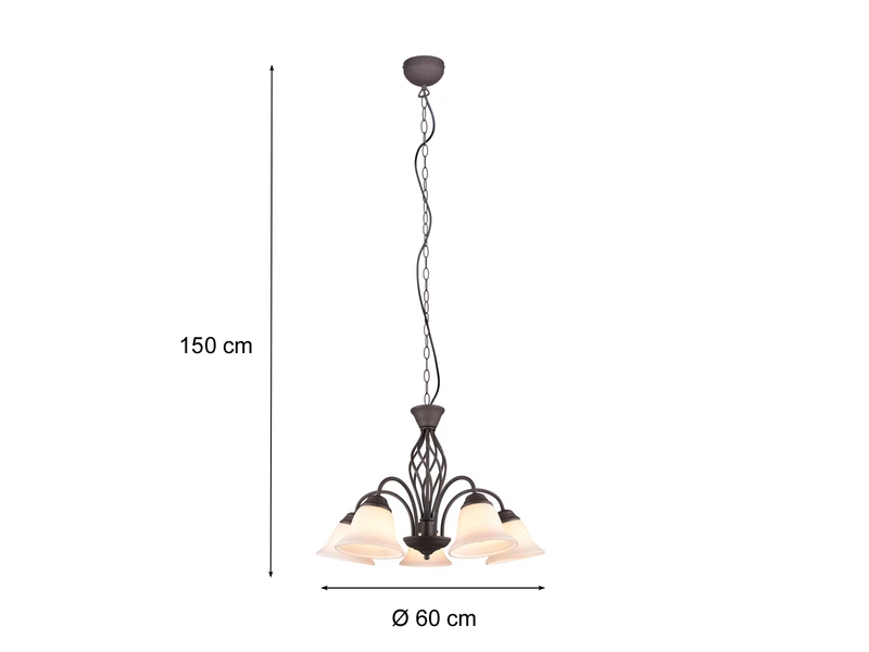 Das Pendel ist mit fünf E14 Fassungen ausgestattet und wird inklusive passender LED Leuchtmittel mit einer Leistung von jeweils 5 Watt und 400 Lumen in Warmweiß geliefert. Diese sind dimmbar, so dass Sie bei zusätzlichem Einbau eines Wanddimmers für eine ganz individuelle Beleuchtung sorgen können.