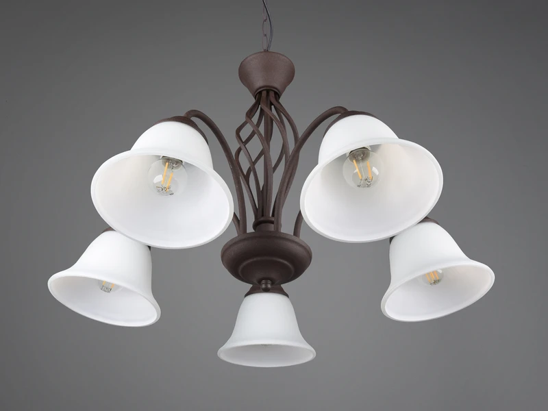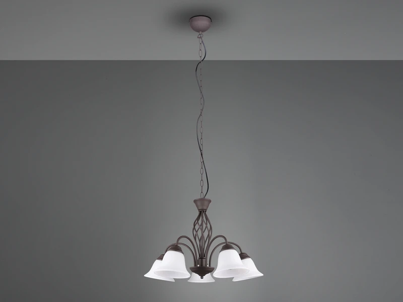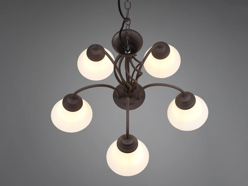 Rustikale Metallelemente treffen auf stilvoll geschwungene Glasschirme, die in Kombination ein besonderes Ambiente schaffen. Die angenehme Rostoptik unterstreicht das rustikale Design der Leuchte, die sich vorzugsweise in klassischen Einrichtungsstilen wiederfindet oder bei modernen Wohnkonzepten für einen spannenden Stilbruch sorgt.