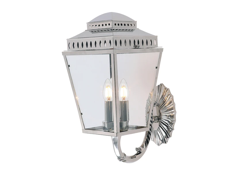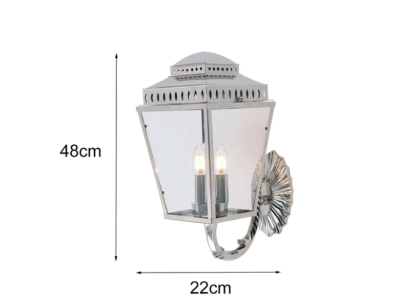Die handgefertigte 48cm hohe Außenwandleuchte besteht aus hochwertigem, massivem Messing in Silber, welches für eine lange Lebensdauer lackiert wurde. Der Lampenschirm besteht aus klarem Glas. Mit ihrer widerstandsfähigen Konstruktion trotzt sie Wind und Wetter und spendet zuverlässig Licht.