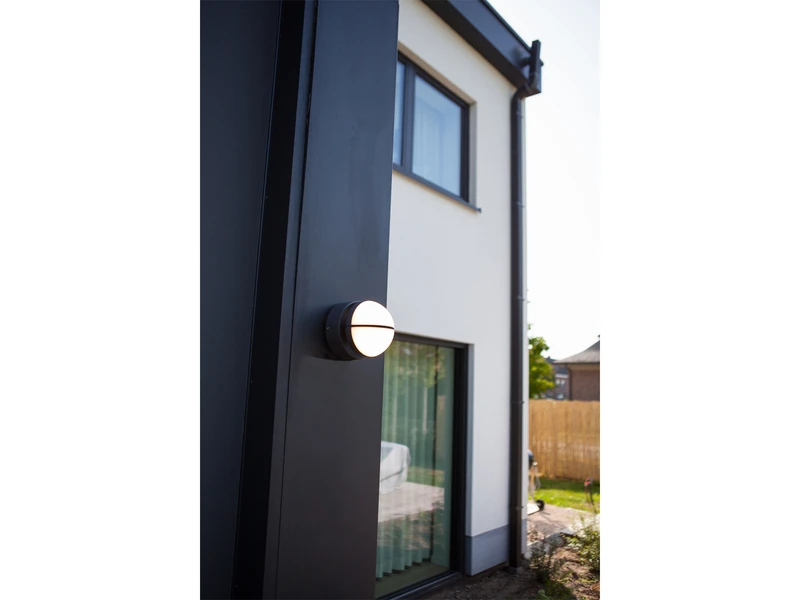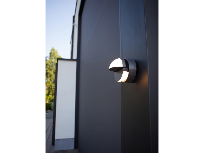 Gefertigt ist die kleine Außenlampe aus wetterbeständigem Aluminiumguss mit Polycarbonat. Durch ihre runde Form passt die anthrazitfarbige Wandleuchte zu vielen Hausfassaden und ergänzt das Gesamtbild harmonisch.